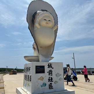 Saturday was jam-packed with Penghu sightseeing thanks to one of the Penghu ETFs serving as our personal tour guide. We woke up early and had some egg and fish congee with youtiao, then the other Chiayi ETFs, the Penghu ETF, my partner, and I started our counterclockwise scoot from Magong to Xiyu. We started at the Oyster Baby Statue at Chengqian Fishing Harbor, which was somewhat cute but mostly unsettling.